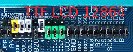 Special Note: When using 1602LCD LCD module, set the connection zone (lower) from left 4, 5, 7 of 3 . A shorting link ( white shorting link in the figure below ) is moved to the top to become RA2-RS , RA3-RW , RA5-EN: When using the 12864 LCD module or TFT colour screen module, in addition to the connection area ( bottom ) left number 4 , 5 , 7 A total of 3 short-circuit links ( white short-circuit links in the figure below ) are moved to the top to become RA2-RS , RA3-RW , RA5-EN , It must also be (lower) left connected region 3 short-circuiting a number of links (blue in the figure shorting link) to move upward,