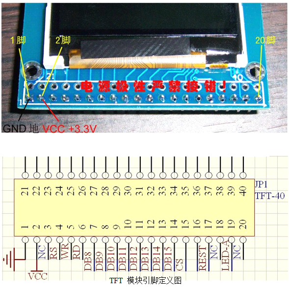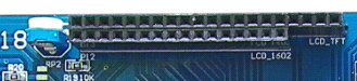 Pins 1-20 of TFT assembly(TFT against the outer edge of the row of the PCB assembly pins) into HL-K18 P11 development board socket. Pay attention to pin 1 of the TFT and insert correctly (with the PCB assembly of the TFT Label) and a pin 1 of HL-K18 development board P11 base is (the development board P11 HL-K18 socket has a small triangle marked on it)aligned. Be careful not to insert it into the P12 socket: Move the four short-circuit links at TCS,RS, RW,and EN in the connection area of the HL-K18 development board to the above position,other shorting links remain in the factory position: Reminder: TFT assembly pins 1-20 are to be inserted into the socket holder of the development board P11 in the correct position and the system Power must be 3.3V. Please double-check before applying power, otherwise it will cause the LCD screen to burn out! Due to being inserted upside down. Insertion errors & power supply errors are not covered by the warranty ! In order to facilitate the user to write the programs for TFT, the following relationship between the pin connections of the TFT display component and the connection of the microcontroller are given.