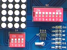 Some data lines are shared between the "dot tube module" and the " digital tube module ". With the "8 * 8LED dot matrix module",set S4 all four toggle "ON", S2 all appropriated "OFF": When the "8 -digit digital tube display module " works , please turn all four S4 to "OFF", and all S2 will be selected to.
