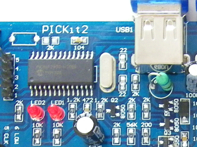 The cable connects the USB1 port to the USB of the computer. Labelled "LED1" mark corresponding LED board PICKIT2 busy indicator PICKIT2 when idle it is not lit, but it will flash when PICKIT2 is working (such as during programming and emulation).